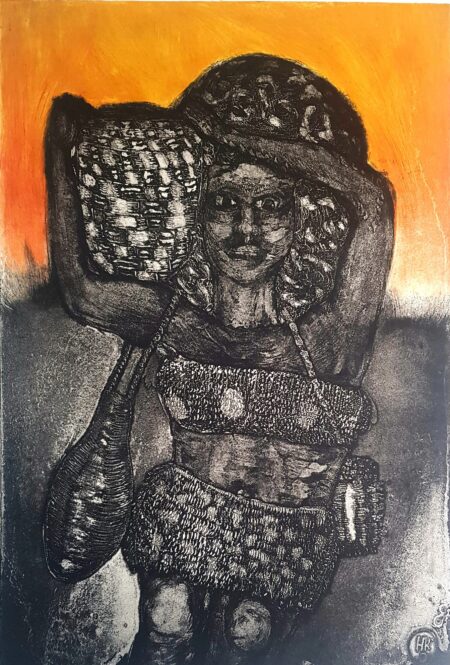 They carried whatever possessions they owned in their handmade baskets. They were like refugees. I have depicted my great-grandmother Ginny Kuranda who lived on the island during this time and was forced to flee. The government used our island as a quarantine station and later for military training and a naval defense base in World War 2. Now the tourists go there to an expensive hotel and swim with the fish and look at the beautiful corals. We still know where the burial sites are and remember the stories of that island.