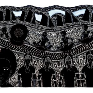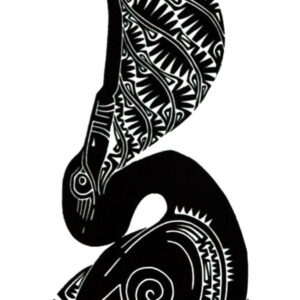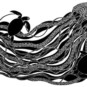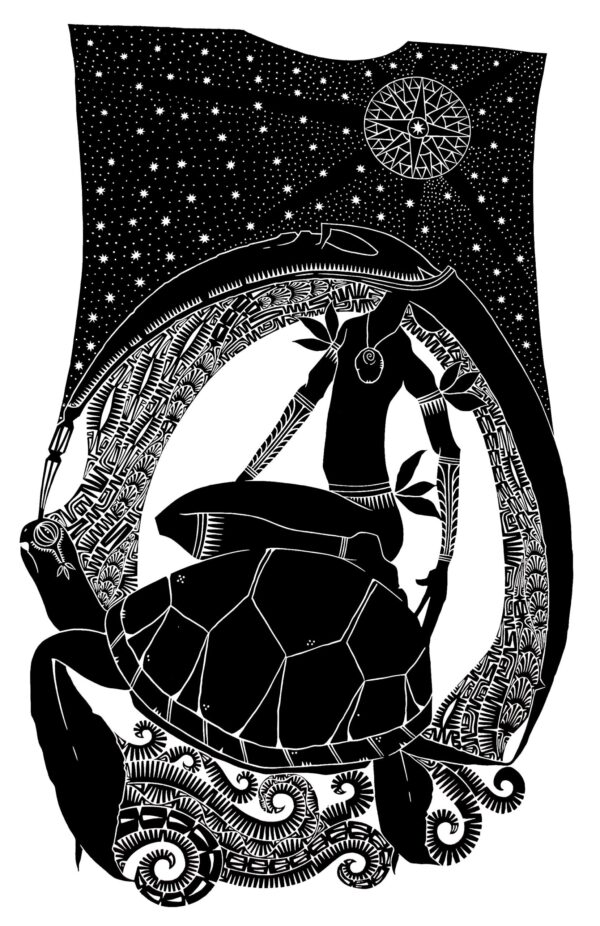 Kek is the Zenadh Kes word for April Star. Kek is also the name of the annual celebration for the ending of the monsoon season and the Torres Straight Island cycle of the new year. In the old days it was the most festive time. Much fuss and effort was made in preparations of ceremony which lasted around the whole month of April. From York Island, Yam (Iama), Darnley (Erub) and Nagir, or Mt Earnest Island, great sea-going canoes of families would travel to Mer (Murray) Island, easternmost of all the islands, with sea and garden foods including dugong, yams and coconuts. Ceremonial objects and weavings were also made at this time. I have illustrated a sea turtle, food for the ceremony and an image of the Zogo Le (Holy man) who also made the journey from each island to lead in song, ceremony and celebration. My ancestors believed that our ceremony brought on the new life for us to be harvested and not the other way around.