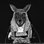 The constellation depicts Tagai, a legendary Zenadh Kes hero, is used to navigate by. Its alignment to the horizon indicates the onset of the turtle-mating season and for garden harvesting / planting. Two waterspouts are depicted crossing the dugong, always a danger to mariners at the onset of the monsoon season from January to April, when the boats are harboured or ‘hoved’ on shore.